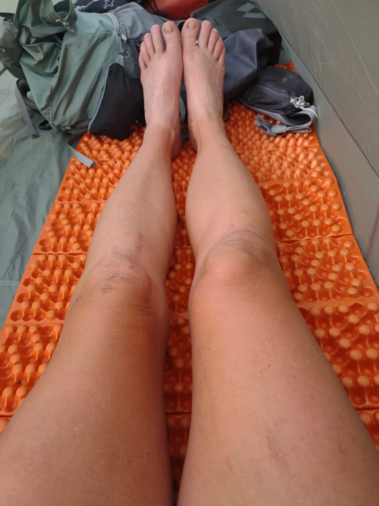 I ate, set up my tent, and hung my food, all in different locations. I searched for the best-looking tree for hanging food. Happy with my work, I turned to walk away and almost stepped in a huge pile of bear scat. Oh well. It was a pretty good hang and the best tree, so I left it. I did not think to bring camp shoes, and I am walking around barefoot to let my feet and shoes dry out from the day’s river hiking. And ouch!! I get stabbed by some kind of thorn or something. I tried to remove it with my tweezers, but it broke, leaving a piece embedded deep. I crossed my fingers and hoped for it to work its way out.