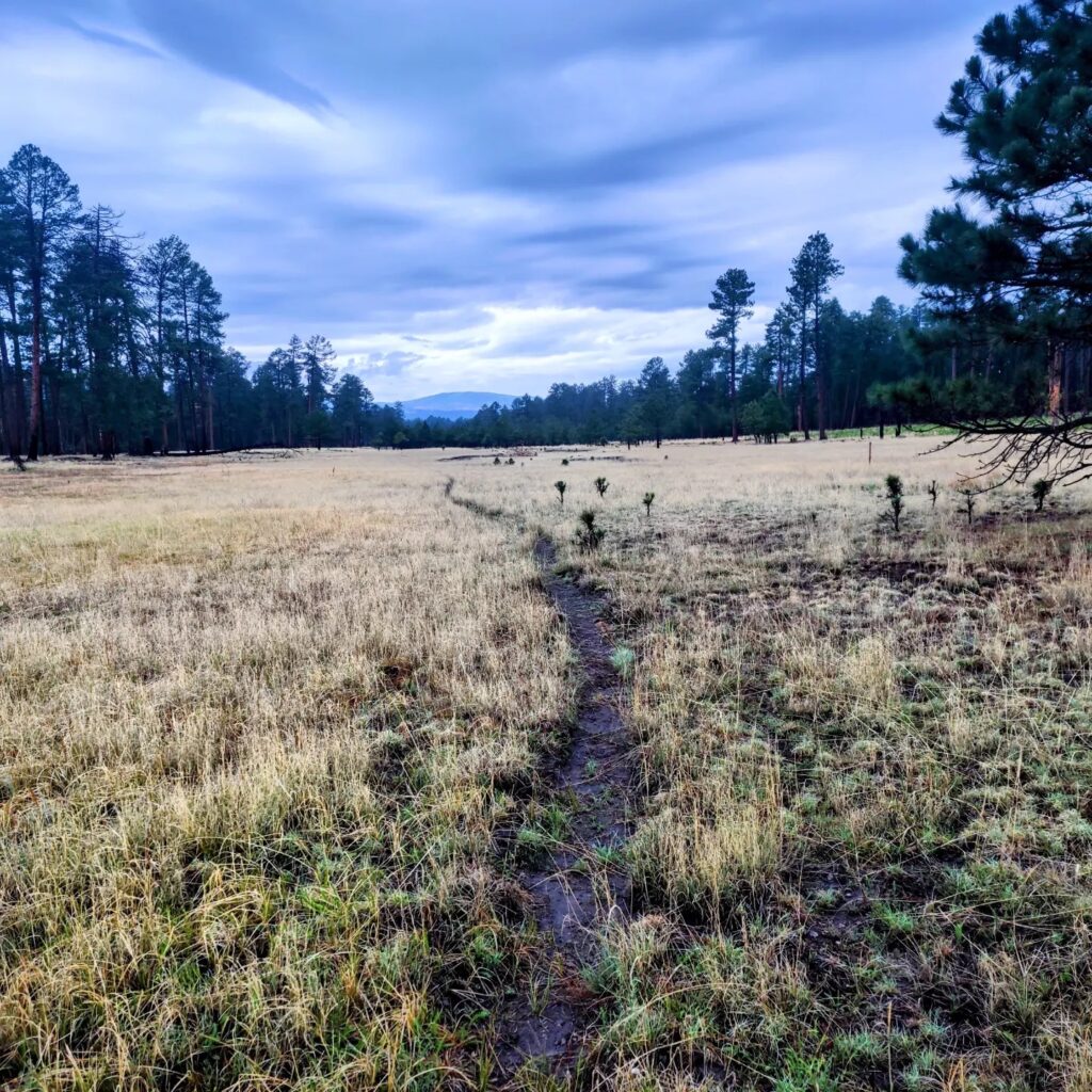 I heard canine noises too. I had heard of a wolf sighting here, but I assumed these were coyote noises. I took a detour to check Rawmeat for water. The name gave me the ickies and before I found water, I found old bones in the dry creek bed. However, it did not take much longer wondering west to find some flowing water. I took a break here to fill my water and dry the remaining moisture from my belongings as the sun was out and powerful at that moment. I also took the opportunity to take my shoes off and hang out in my flip-flops. Sometimes just a five-minute no-shoes break can be a game-changer to tired and yucky sweat-soaked feet. Feeling rejuvenated, I headed back towards the heart of Mckenna Park, excited for more. The sky started to look doom and gloom again, so I checked the weather with my inReach.