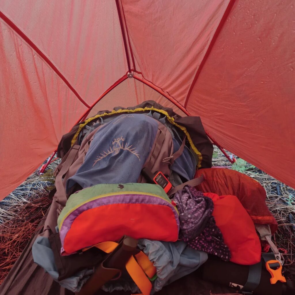 However, the morning was dry, so I hung my stuff around camp to let it dry out and got a late start to hiking. When I repacked my bag, I did it in a way that made it even easier to set up my storm shelter when needed. I wrapped my ground cover and rain fly around my tent poles and put them in the outside pocket of my backpack.