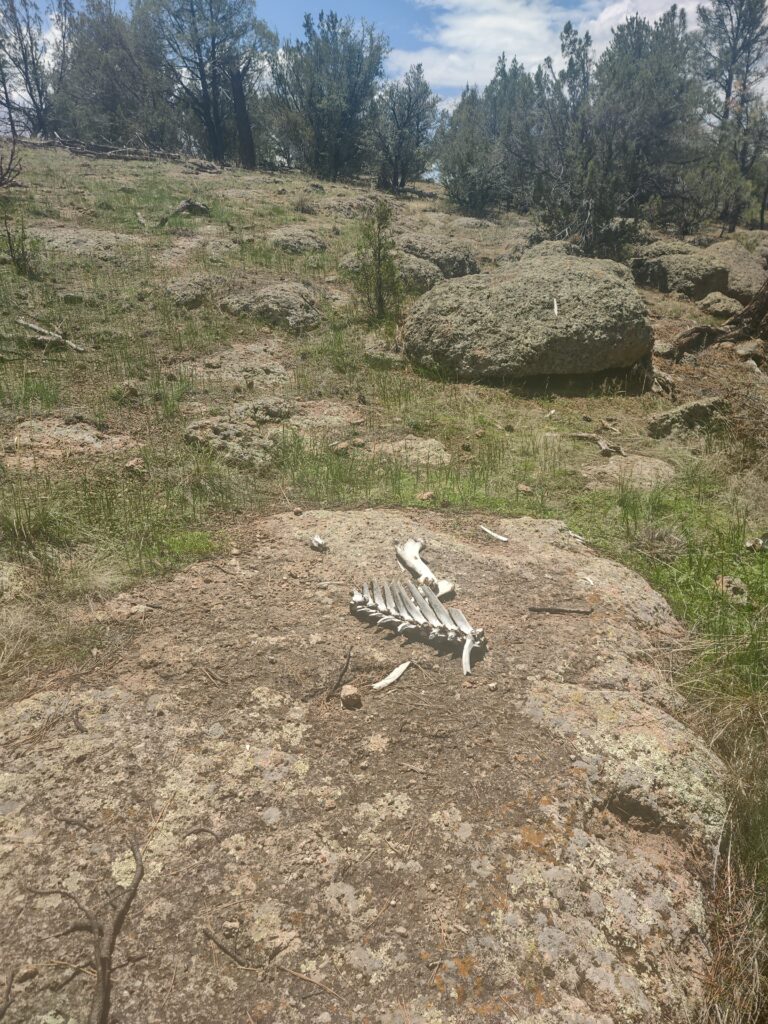 I was trying out some new trail food, and although I was super happy with the food choices, the packaging and amount I brought was too much, and was feeling my heavy pack. After checking Antelope Tank, I ended up at an old corral unexpectedly and realized I missed a turn. I did not see a footpath past the corral but according to my maps, I would come across another trail soon. I tried to navigate to it but ended up off-trail hiking for a while and following the direction my compass pointed me until finally, I intersected with a trail. The trail was easy to keep after that, except when I accidentally followed a trail to a backcountry camp. The camp was covered in bones and, like always, I told myself scary stories about how they got there. Is it even fun being in the wilderness alone if you aren’t at least a little bit freaked out? I noted to myself that I had been seeing a lot more animal bones than I had on any other trip (more than all my trips combined even) and it felt like it was a prelude to something….