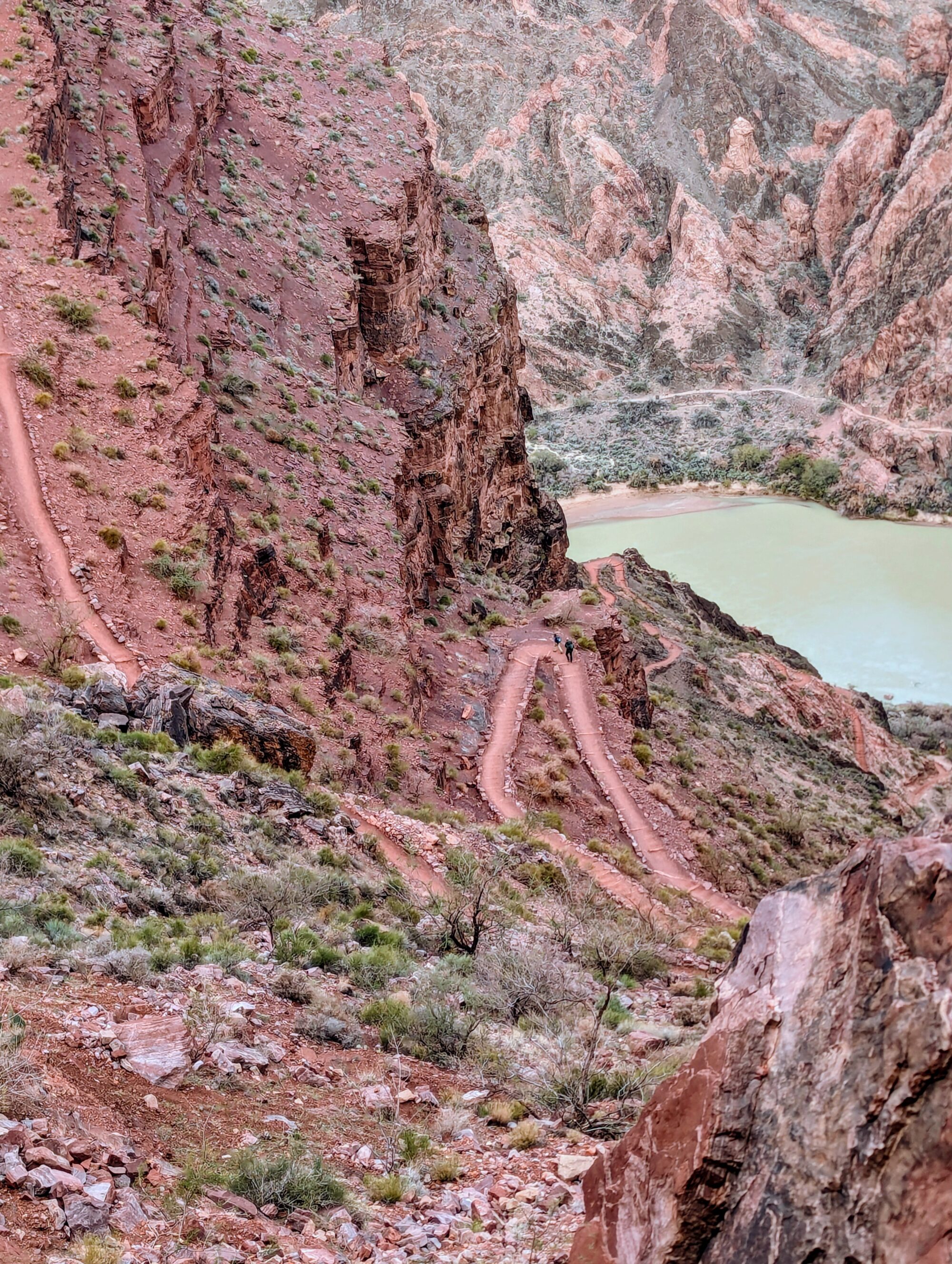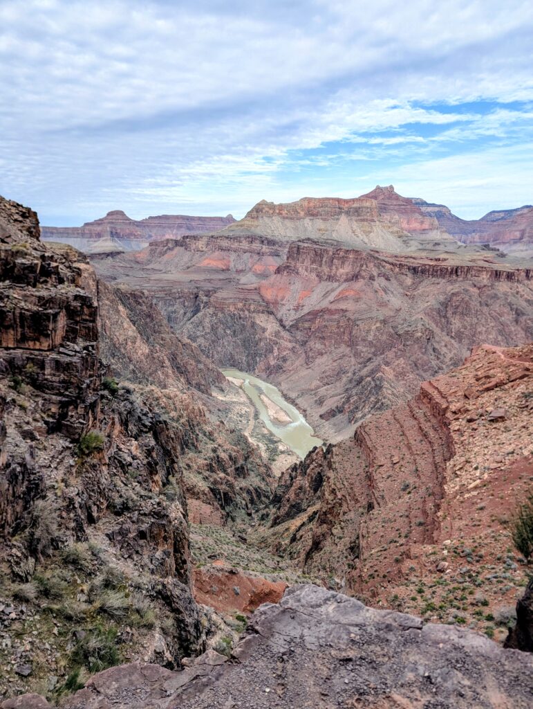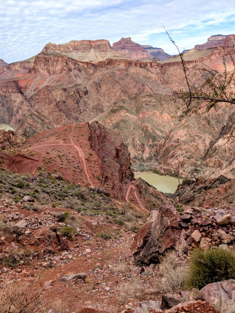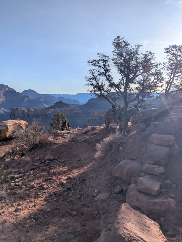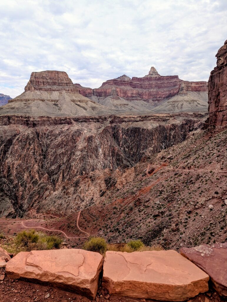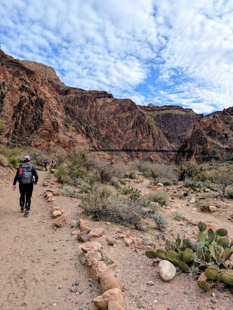 We had breakfast back at the van in the parking lot before getting on the shuttle to go to the South Kaibab trailhead. I was hoping for a Rim to River to Rim hike but was not sure if Dan was up to it. The plan was for him to go as far as he thought he should and turn around – and I could do the full hike if I was up to it. Problem is, Dan loves the downhill. I even had to jog a bit to keep up with him. We got to Phantom Ranch together and took a short break.