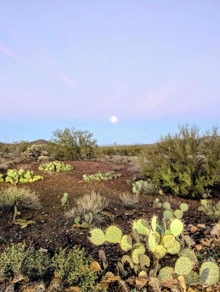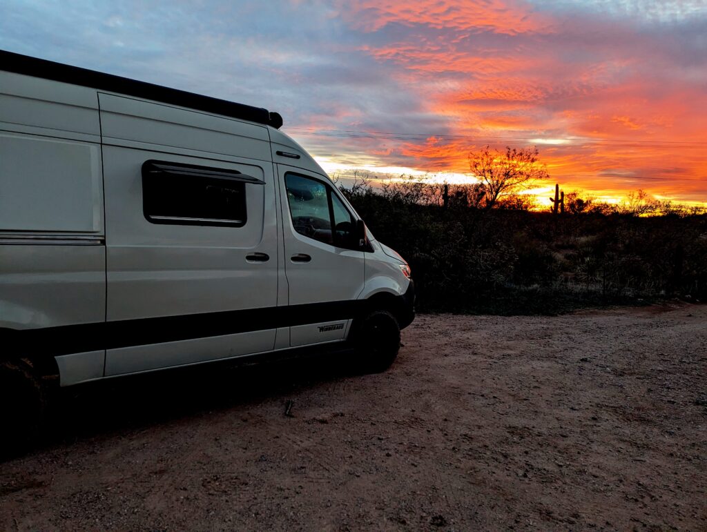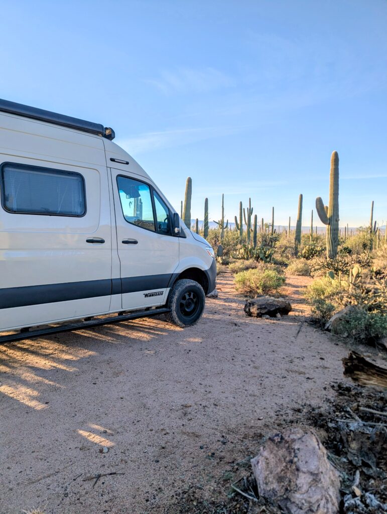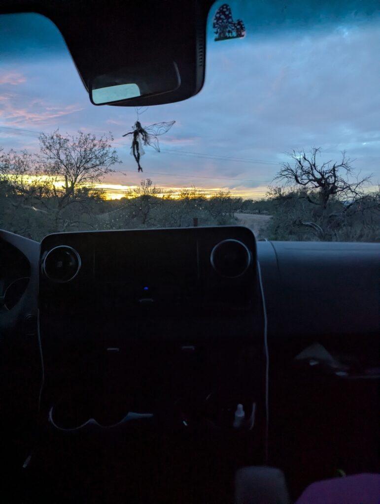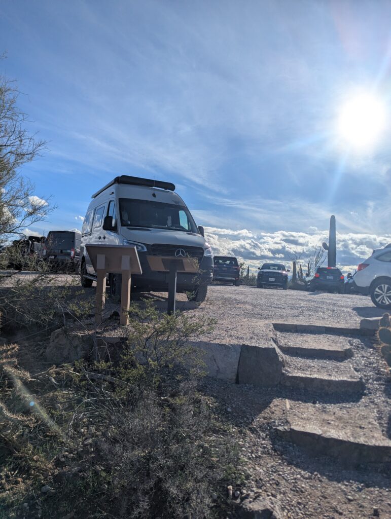 Attempting to gain comfort behind the wheel again, I drove in circles trying to find my way out of the airport. Usually I plan while Dan drives, so I drove to the closest Planet Fitness to make a plan. I was going to workout and assess if Planet Fitness looked like a proper place to stay the night. There were no signs saying you couldn’t stay, but it did not seem like the nicest area. Lots of iOverlander reviews of stealth camping spots in the city mentioned homeless people and drugs. I decided to drive to the Planet Fitness in Mesa instead because it had better reviews and was on the way to other places I was considering going. After a quick workout and shower in Mesa, I decided to stop hesitating and be a big girl again. Pointing Revel Rose towards Tucson, we set out for Saguaro National Park. I stayed on Arizona State Trust Land outside of Marana that night. It was super easy; you can buy a yearly family permit for $20 online. It was not far off the highway, and very quiet. I stayed in the staging area where there was also a converted school bus but plenty of space. A big group gathered there in the morning, including a canine unit walking around for something. But no one bothered me and I felt safe.