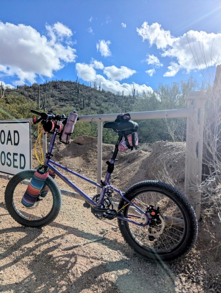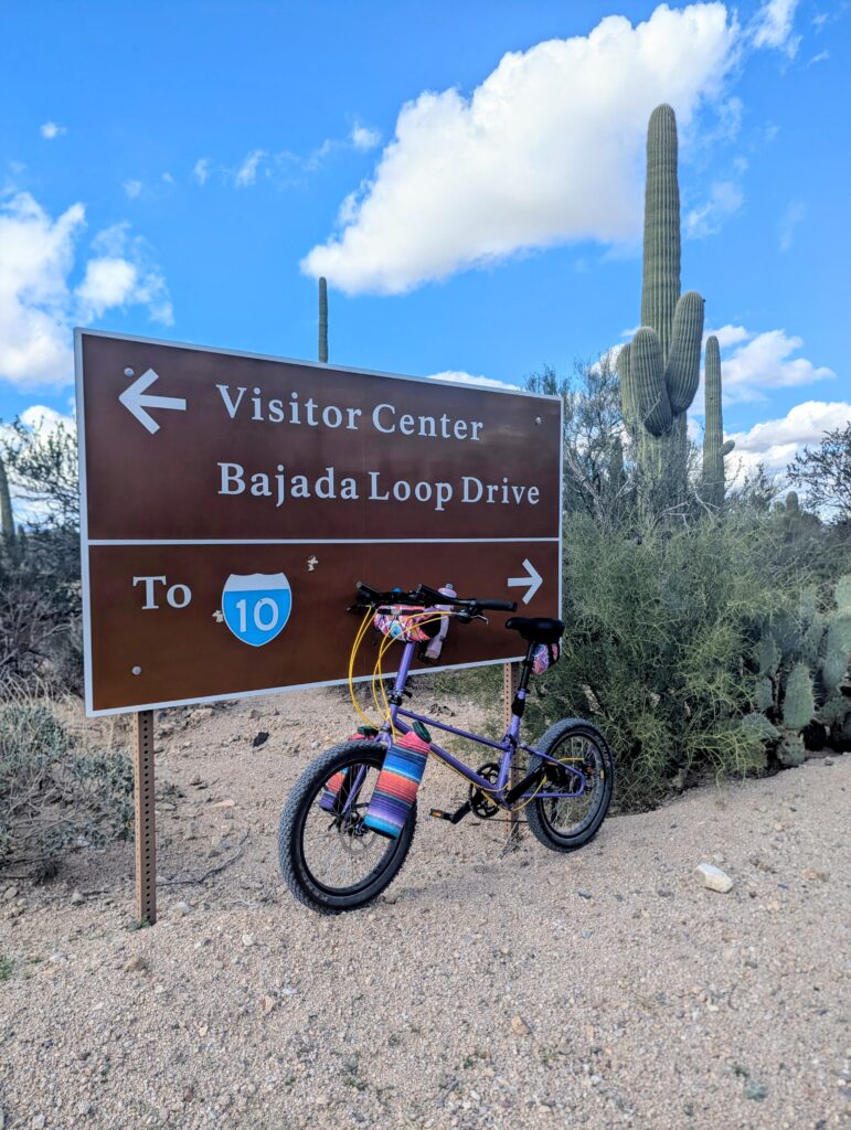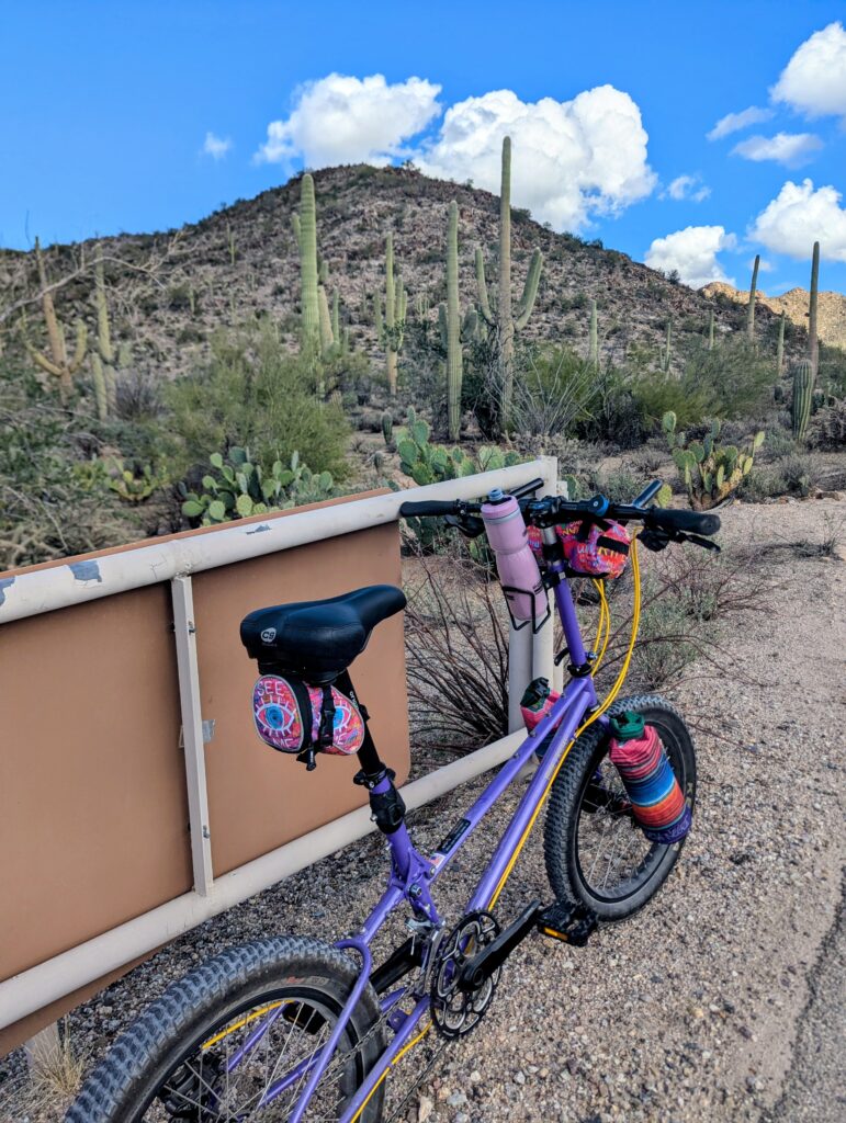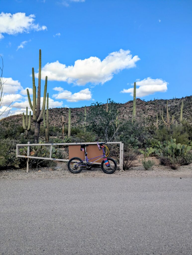 It was so peaceful in the staging area of the Trust Land, I slept in and got a late start at the Saguaro National Park visitor center. I was immediately in awe and in love with the landscape there. I had wanted to do a 10 mile hike out and back up the highest peak in the west side, Wasson Peak. However, I was starting to push whether or not I had enough daylight left and the parking was full at the trailhead. So I drove until I found parking and got out my gravel BikeFriday. It was a nice dirt road with some elevation and views. The loop was about 6 miles and I rode it twice, once continuously and once to stop for pictures.