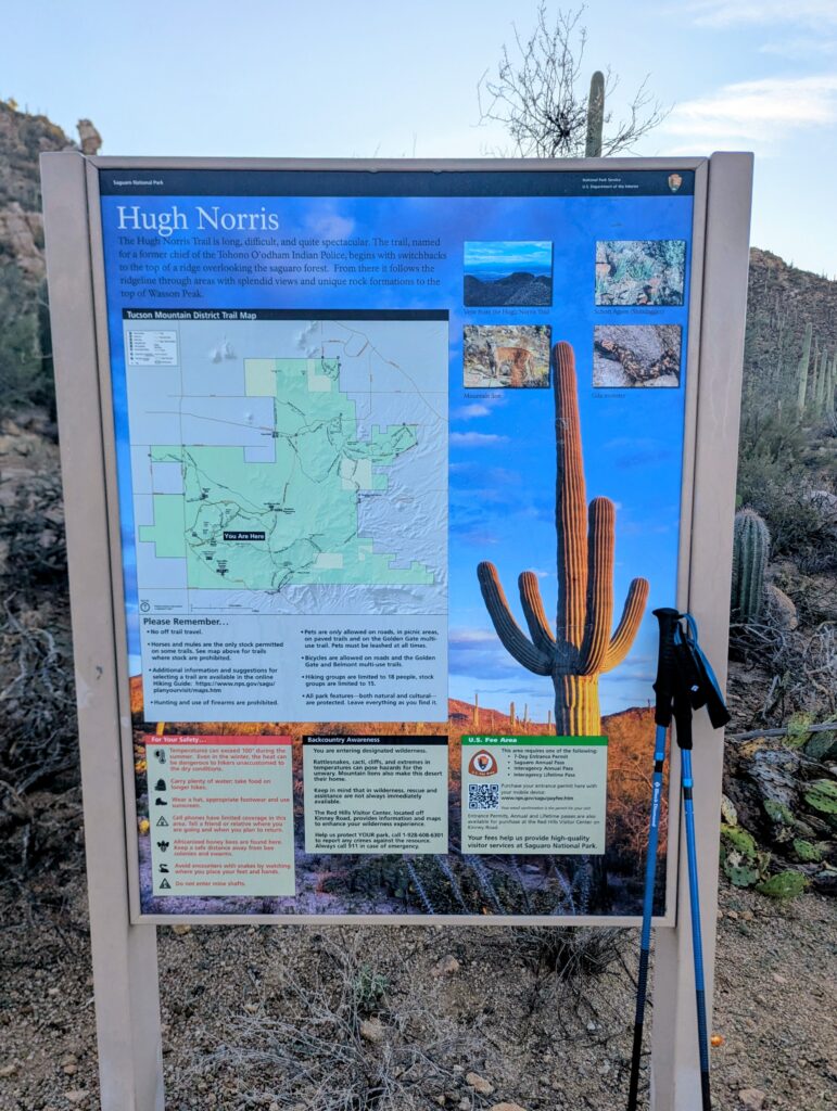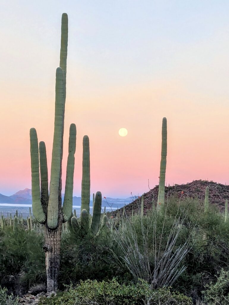 I had to drive through the Tucson Mountain Park to get to the trailhead the next day. Both the park and dirt road to the trailhead had signs that they opened at dusk, so I waited for the sun to start rising before leaving the BLM land and was happy to get out of there early. And the morning views were absolutely breathtaking.