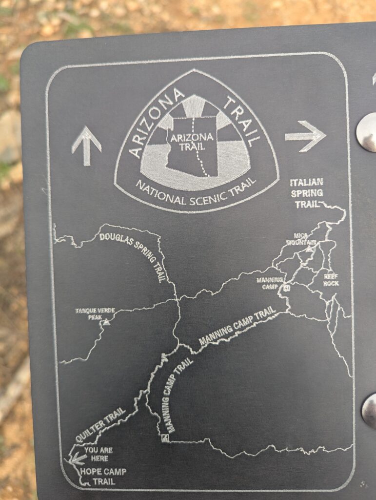 Since I was so close to the Colossal Cave Mountain Park, I decided to check it out first. I was not interested in touring the cave, but the Arizona Trail went through the park too. I started at the visitor center to use the restroom and get more information. They had a snack bar and I was able to get a breakfast sandwich and French fries, which was pretty good and unexpected. I got maps of the park from the visitor center and went to find the Arizona Trail crossing. I found it near a super cute picnic area. The trailhead was to an uninteresting wash. I do not know if it changed but I decided I would check out the trail from the Saguaro instead. I parked at the Quilter Trail which intersects with the AZT and really enjoyed the scenes on this section. I even did a little bit of jogging.
